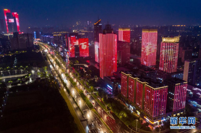 | 这是6月25日在南京市河西新城中轴线拍摄的庆祝建党百年主题灯光秀(无人机照片)。新华社记者 李博 摄 |