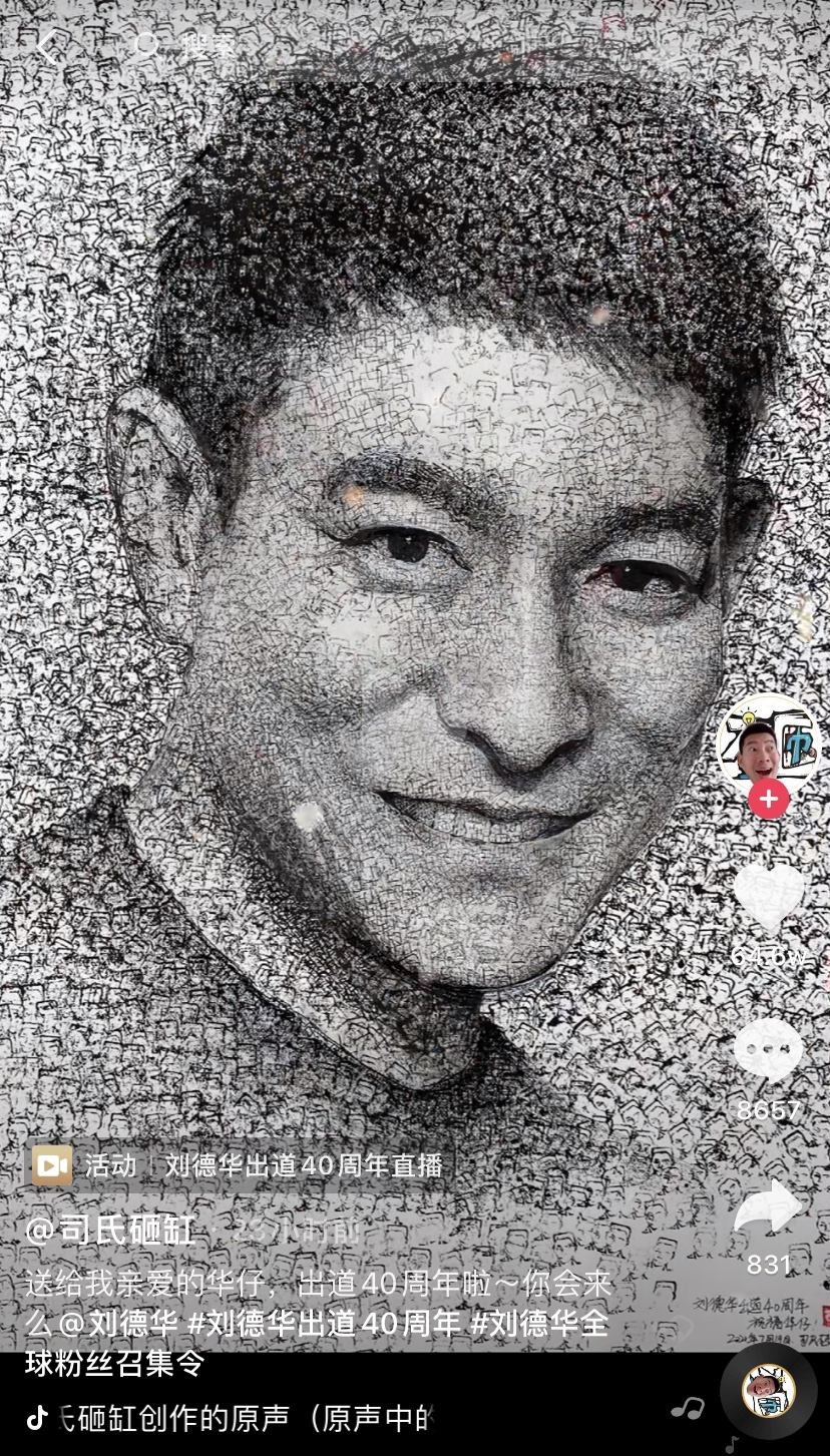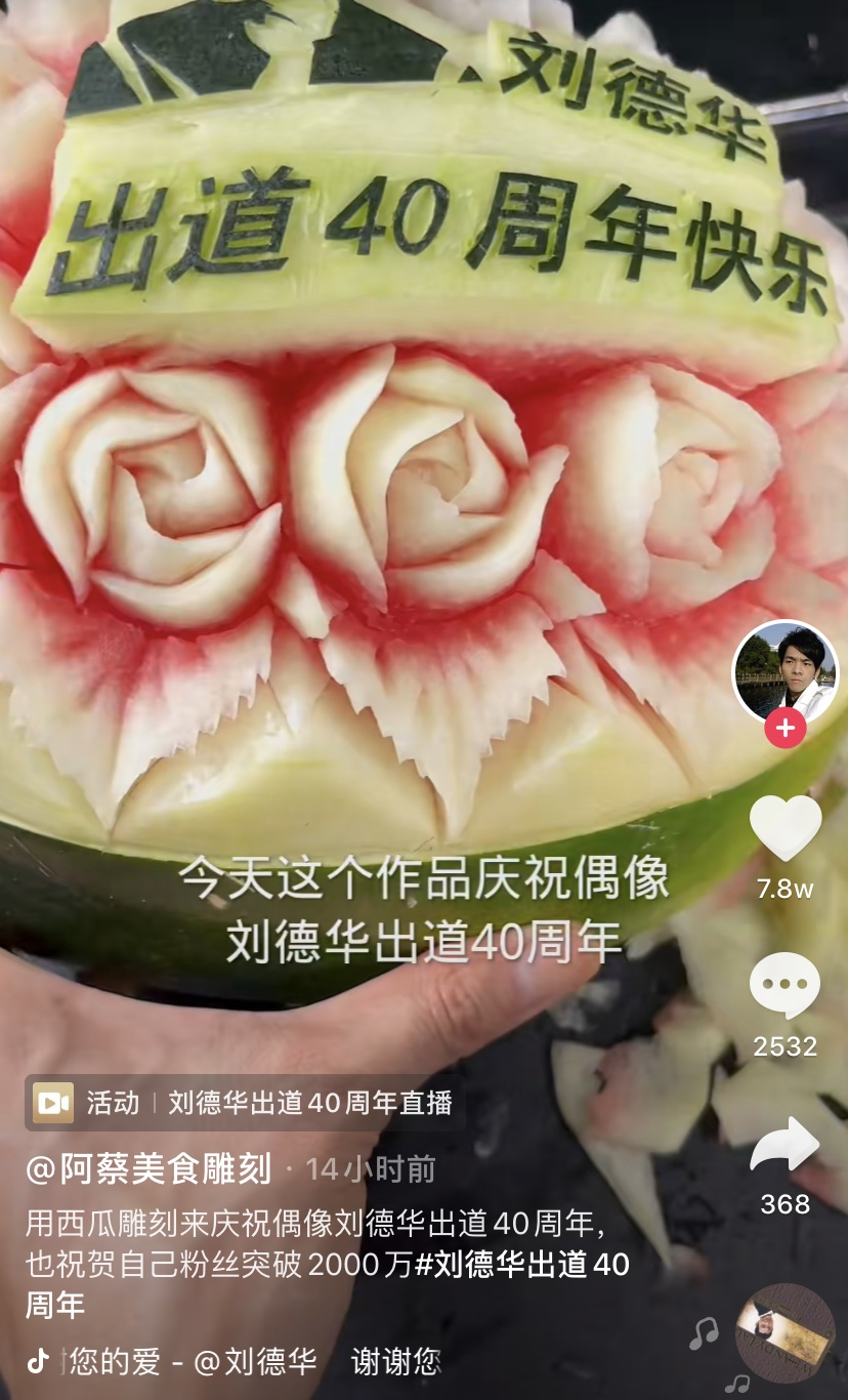 在“刘德华全球粉丝召集令”话题下,无数华迷脑洞大开:美术达人“司氏砸缸”通过无数个手刻印章的深浅明暗变化,组成了一张巨大的刘德华画像;美食达人“阿蔡美食雕刻”把西瓜雕刻成了一个玫瑰花蛋糕;美妆达人“崔佳楠”带来了刘德华的仿妆秀。