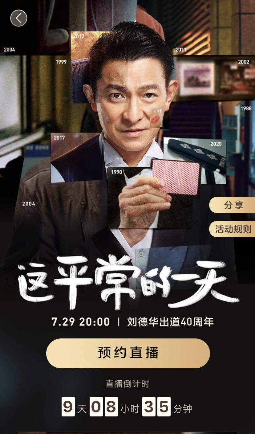 7月19日,刘德华在抖音上发布了一则短视频,宣布自己将在7月29日晚八点首次抖音直播,以纪念“出道40周年”。视频中,刘德华身后是幕布后的舞者,以光影变幻的形式悄然展示着他40年的成就。有心人或许会留意到,这则视频还Cue到了他的金曲《男人哭吧不是罪》、《笨小孩》。这则点赞破千万的短视频迅速登上抖音热榜TOP1。今天,刘德华在最新的短视频中表示,“我最想感谢的就是你,希望和你们一起度过平凡的每一天”,瞬间令华迷们泪目。