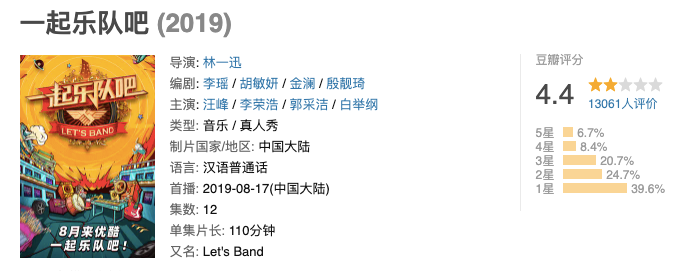 《草莓星球来的人》并不是优酷近年来第一档乐队相关综艺,2019年其出品的《一起乐队吧》,也是乐队综艺刚热起来的一年,只不过《一起乐队吧》也没能收获市场的认可,豆瓣评分停在了4.4。