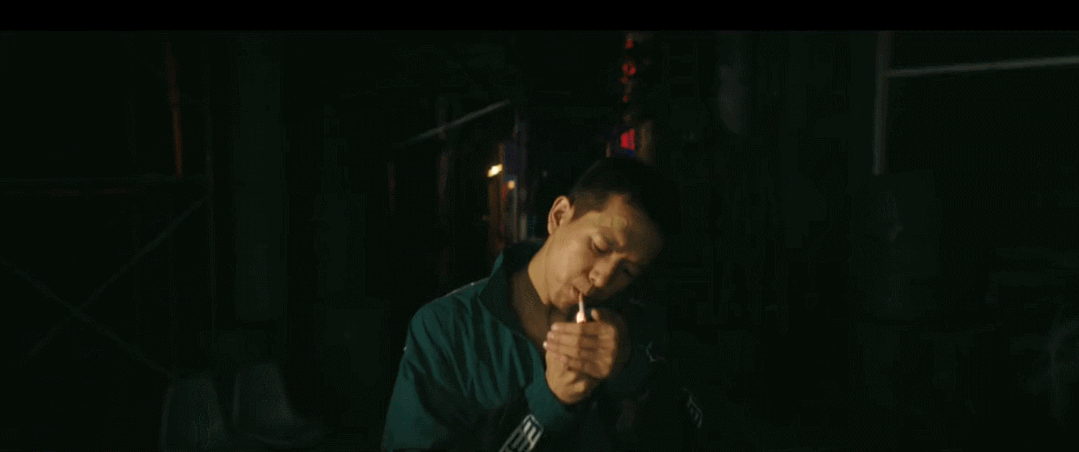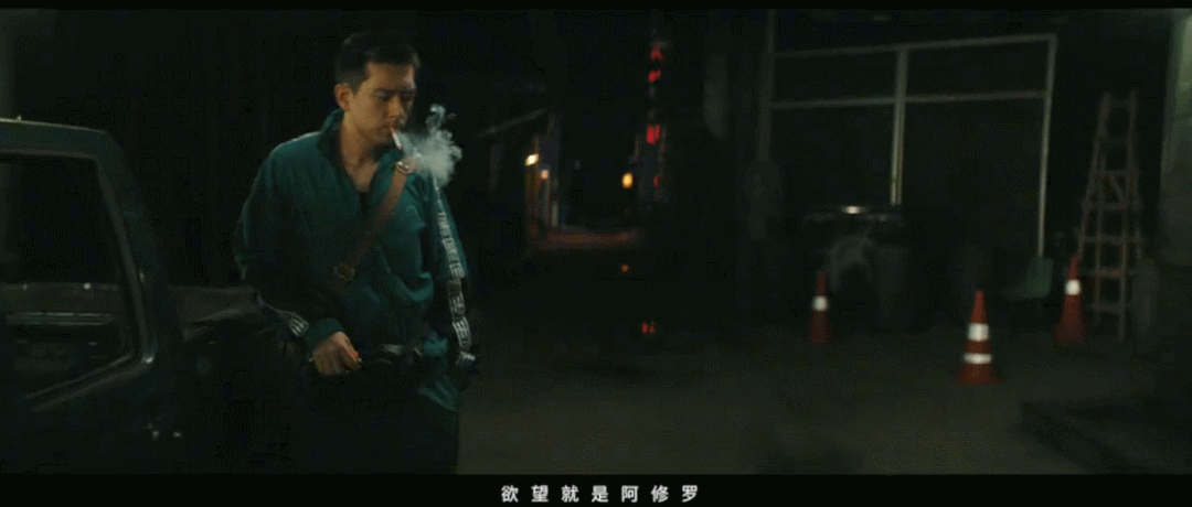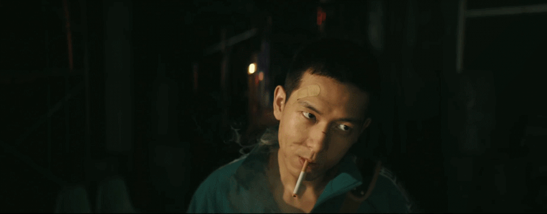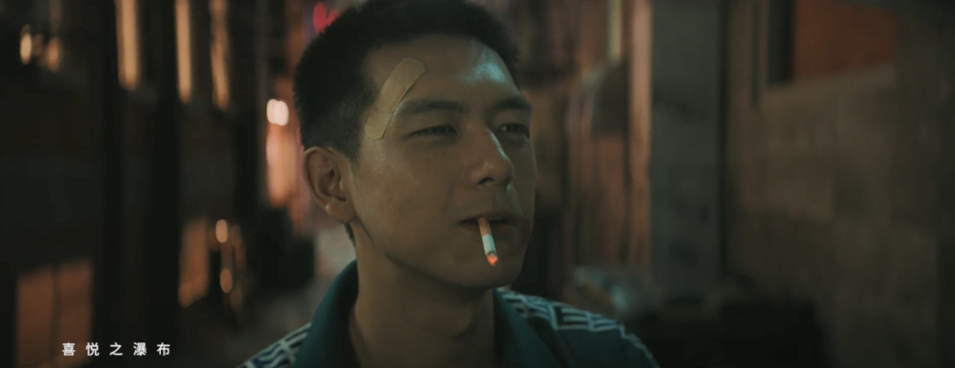 从景深中走出来后,点烟,眼神中又有些不羁。
