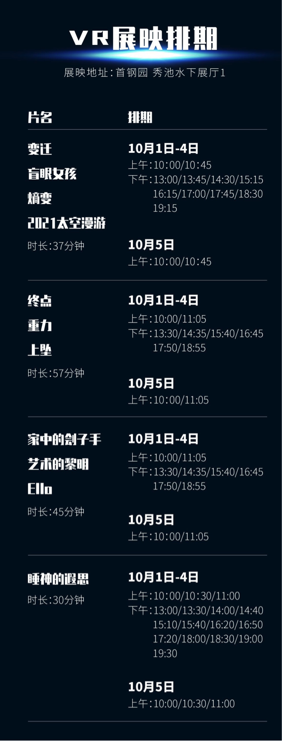 VR展映排期如下,请在猫眼“第十一届北京国际电影节专题页”购票。