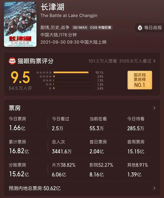 目前来看,《长津湖》应该能稳稳拿下这个档期的票房冠军(虽然都是吴京的“胜利”)。