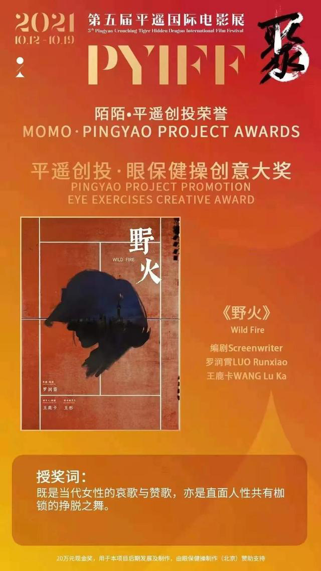 在创投颁奖典礼上,由罗润霄导演,罗润霄、王鹿卡编剧的《野火》脱颖而出,最终获得“平遥创投·眼保健操创意大奖”,20万现金将为本项目后期发展及制作提供支持。