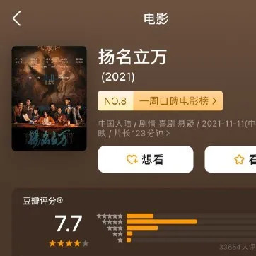 由刘循子墨执导,韩寒监制的悬疑喜剧片《扬名立万》,打败《007:无暇赴死》和《长津湖》,成为了单日票房冠军,口碑表现也好,豆瓣评分一路上涨,从7.5升至7.7。