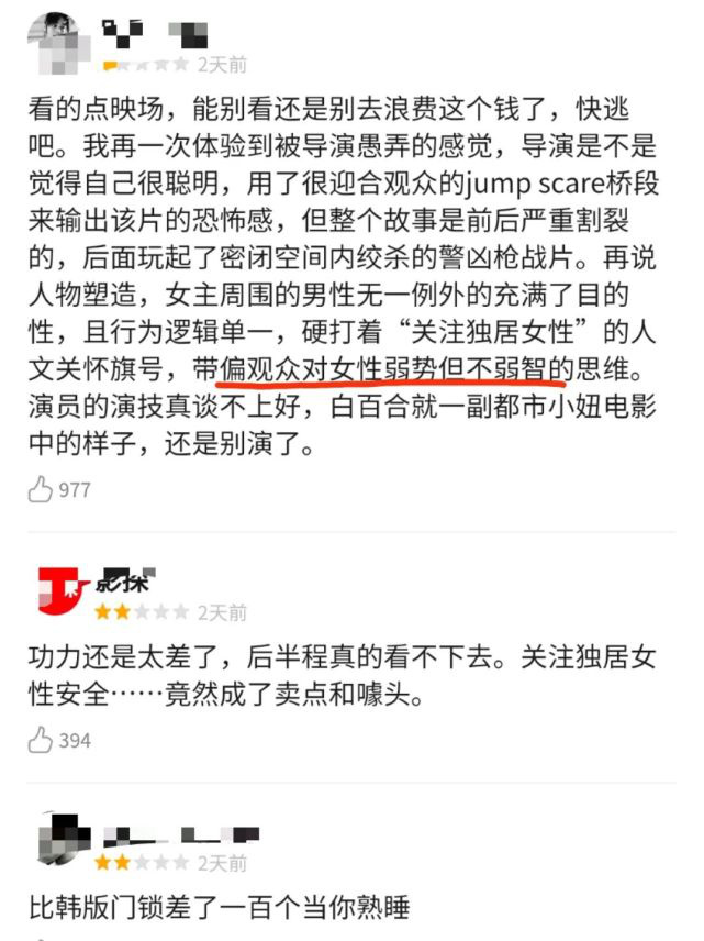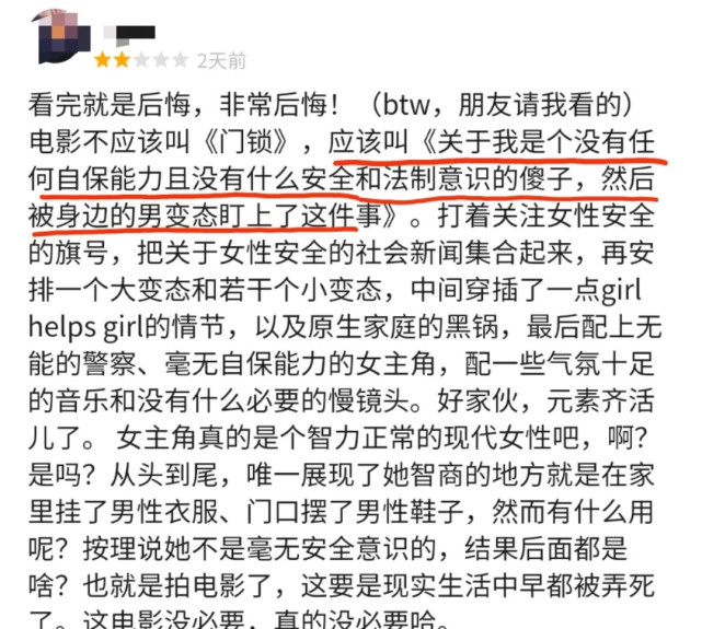 电影打着“关注独居女性安全问题”的噱头,刻意安排全员反派的男性角色,但是实际呈现的仍旧是离了男人活不了的无脑女生,纯靠各种动作戏制造看点然后配上几句口号完成任务。