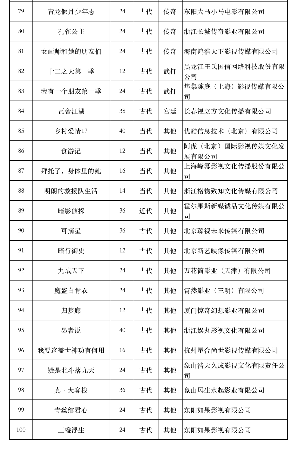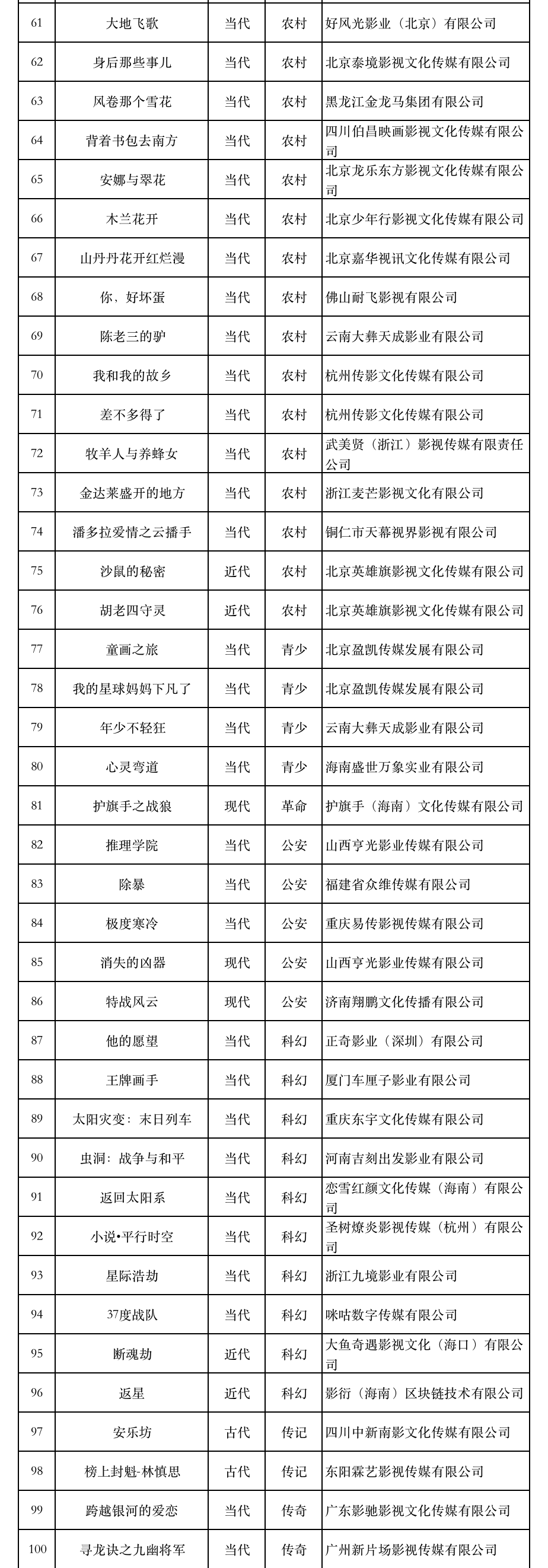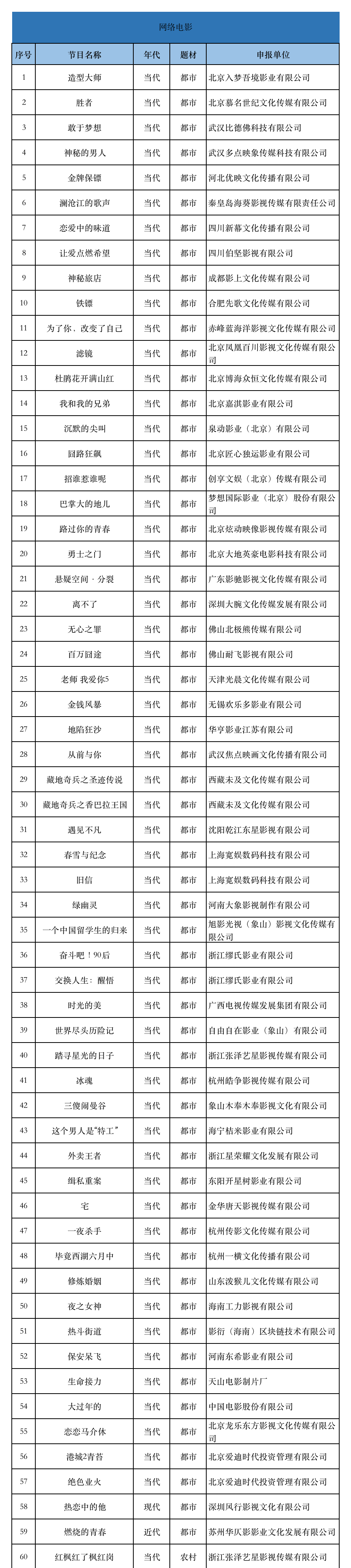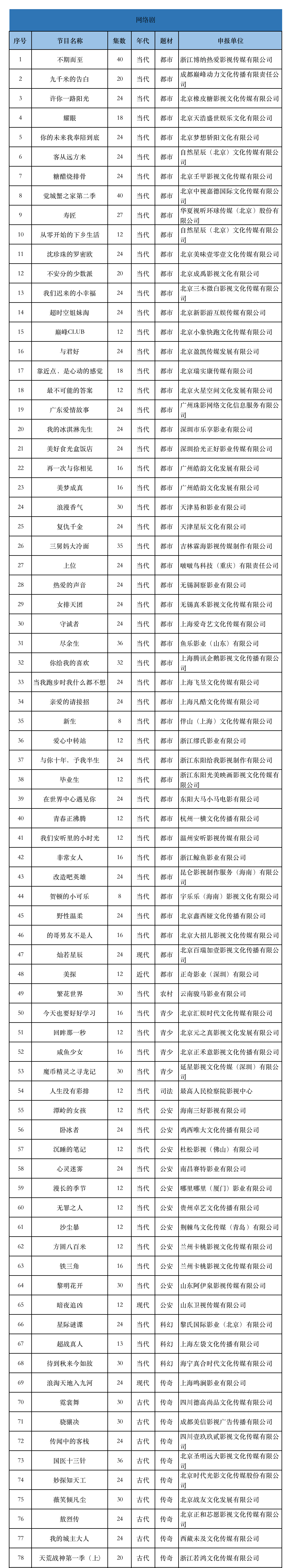按照题材划分,网络剧中,都市题材48部1044集,农村题材1部30集,青少题材4部74集,司法题材1部12集,公安题材11部178集,科幻题材3部67集,传奇题材13部338集,武打题材2部36集,宫廷题材1部38集,其他题材16部390集。