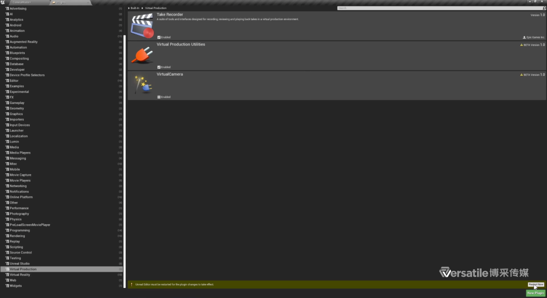 研发团队开发了一款插件:Versatile_iPadCamera,在UE中将插件勾选打开,iPad就可以远程控制UE中的虚拟相机。