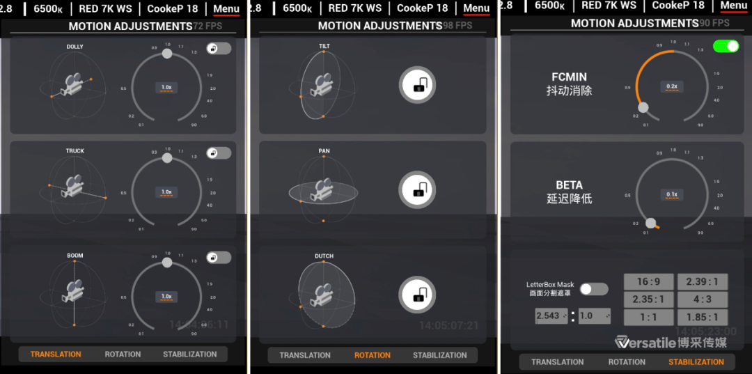 Menu菜单中,可以进行一些相机功能设置,比如Tilt、Pan、Dutch三个轴向的运动可以根据拍摄需要锁住,前后、上下、左右的移动也可以更改移动倍率等。