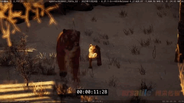 定位了数据,就可以在动捕软件里进行数据修复与骨骼匹配,把猫咪动作转化成老虎动作,并最终在UE里配合场景实时呈现。