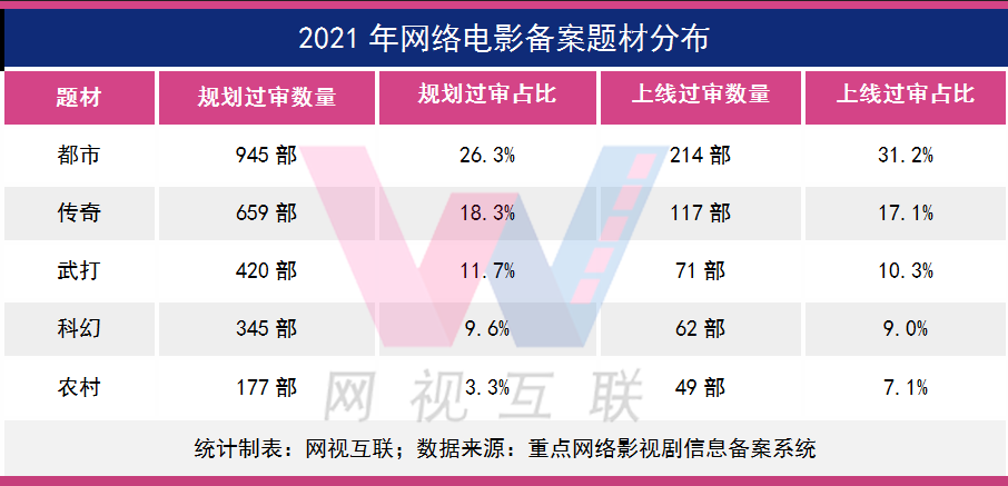 除数量持续领跑的“都市”题材外,传奇题材规划过审659部,武打题材规划过审420部,科幻345部,农村177部,占比也相对稳定,是网络电影市场备案最热门的五大题材。