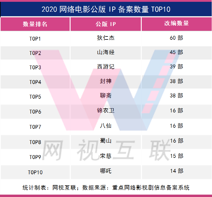 网视互联统计出了2021年备案最多的10大公版IP,其中“聊斋”相关题材高达34部,仅“画皮”就有6部,成为公版IP改编的大热门。