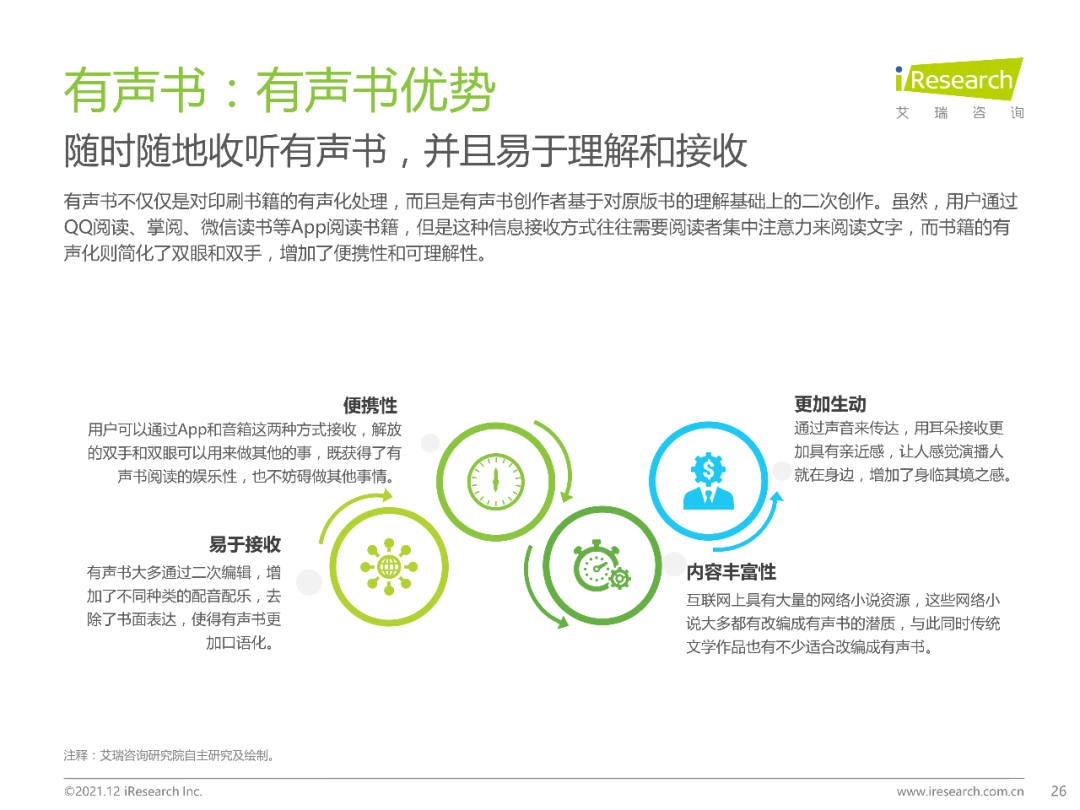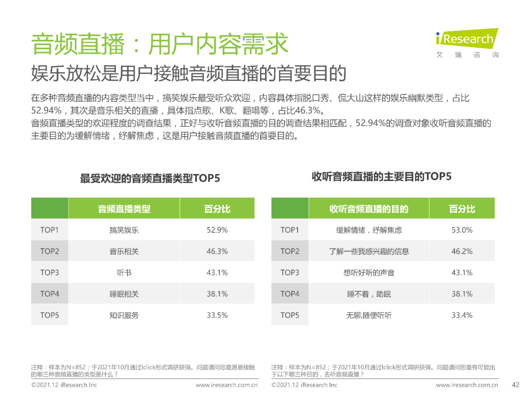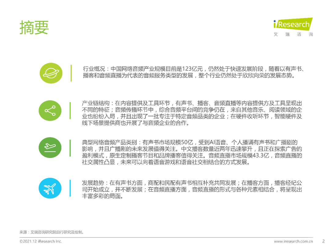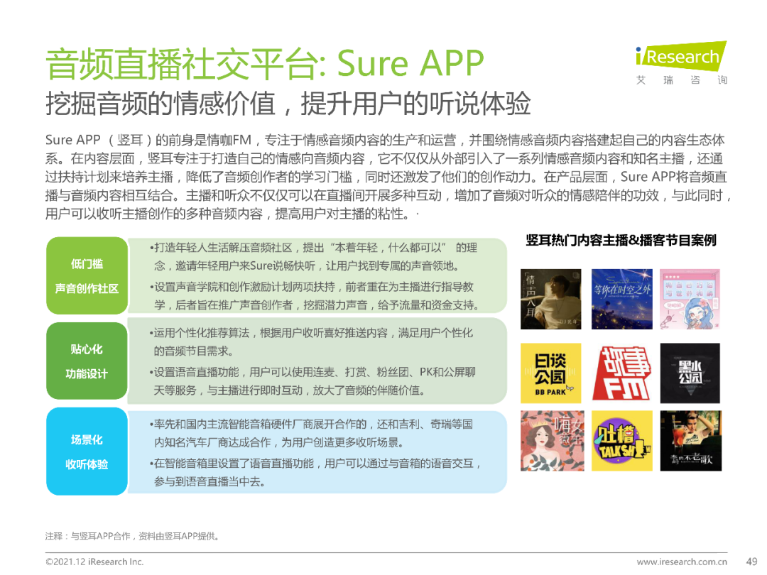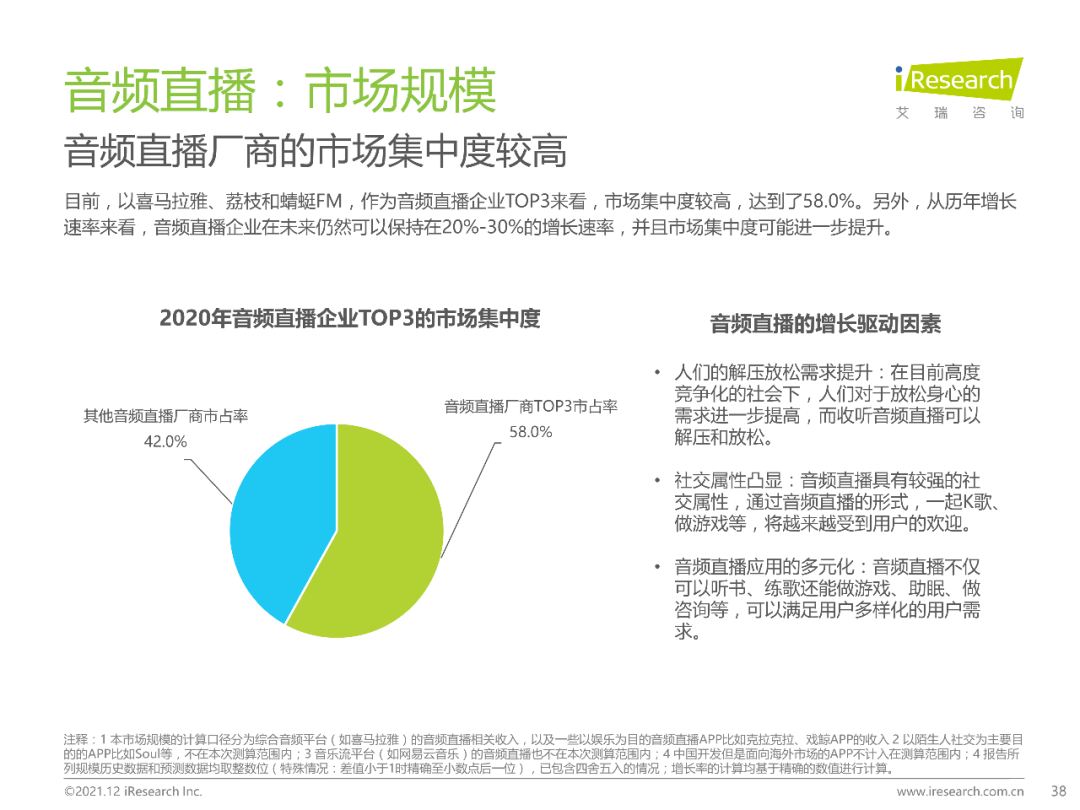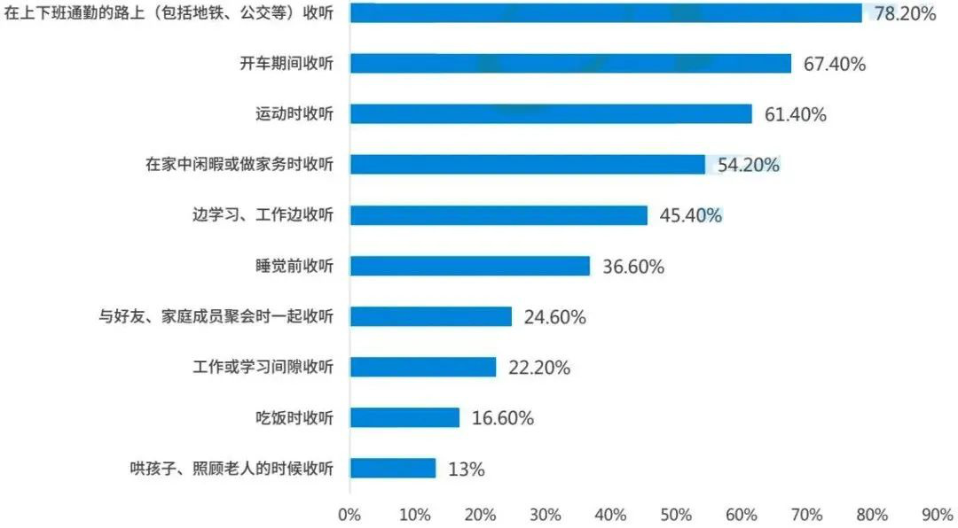 目前,“耳朵经济”市场开始进入稳定期。随着用户收听习惯的逐渐养成和应用场景的不断丰富,未来在线音频市场规模将会释放出更大的潜力空间。碎片化趋势下,在线音频越来越受到人们的青睐,经济价值凸显。听觉内容形态有效地在长短视频之外扩充了人们的内容消费场景,如通勤、助眠和亲子陪伴等,由此逐渐发挥出不可小觑的商业潜力。78%的用户选择在通勤时收听音频内容,开车和运动期间也是在线用户使用音频的常见场景。