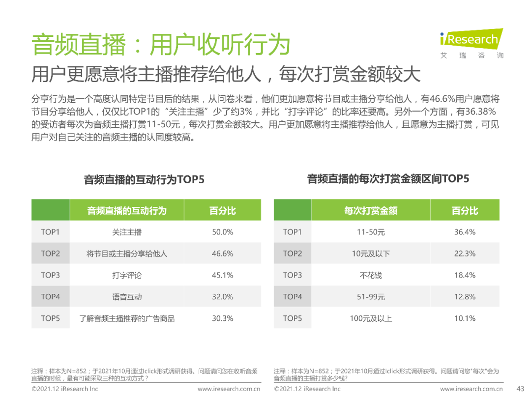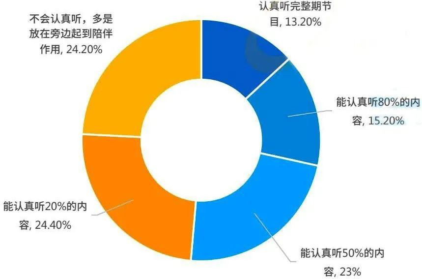 相比较于其他内容产品,音频内容的陪伴属性强,同时在平台推荐和用户自主收听的组合基础上,用户获得更适合自身内容的概率高。51.4%的用户表示在收听一档音频节目时,可以认真收听50%以上的内容。认真听完80%以上内容的用户合计占比28.4%,在音频内容时长相对较长的背景下,这一系列数据说明了大部分用户对音频内容质量的认可。目前还仅有很少部分在线用户接触过品牌定制音频节目,表明这一市场处在蓝海阶段,拥有较大的发展潜力,值得更多品牌关注。