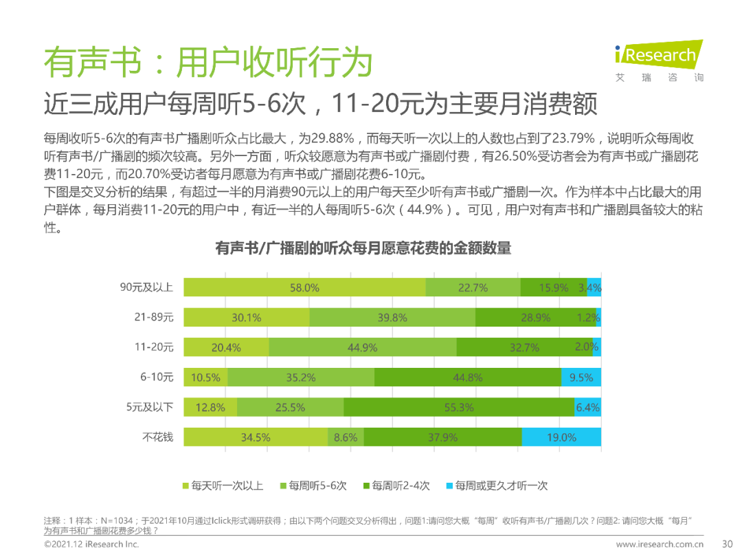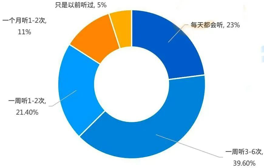 在线用户对音频内容的使用频率不断提高。超过八成的用户有每周听音频的习惯;一周听3—6次的用户占比接近40%,是最为庞大的群体;其次是每天都听音频的用户,占比达到20%以上。