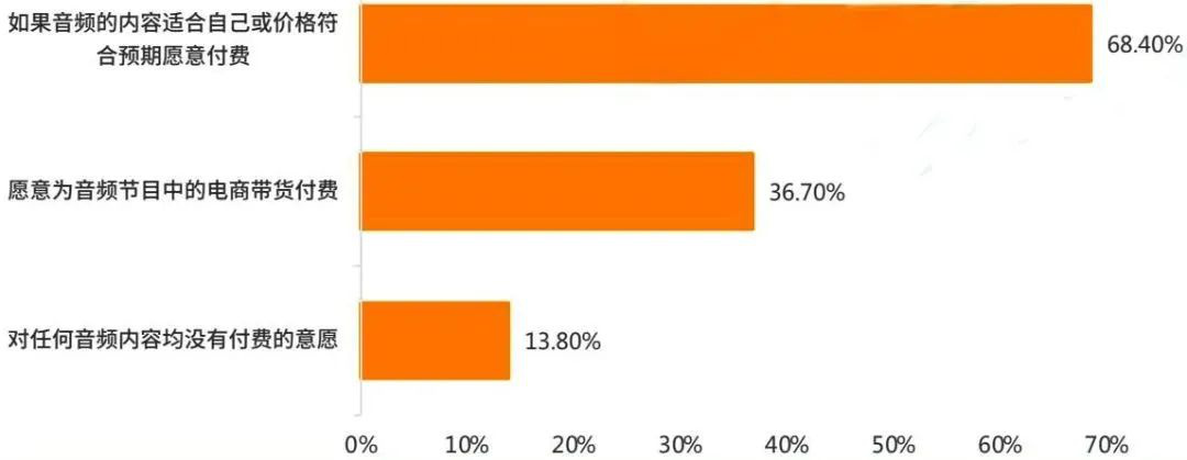 68.4%的用户表示在音频内容优秀和价格合适的情况下愿意为其付费。用户对电商带货这一消费形式也拥有较高的接受度,36.7%的用户愿意为音频节目中的电商带货付费。
