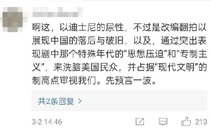 评论里有预言家说,按迪士尼的“尿性”,要恶意改编,突出中国的落后和破旧。