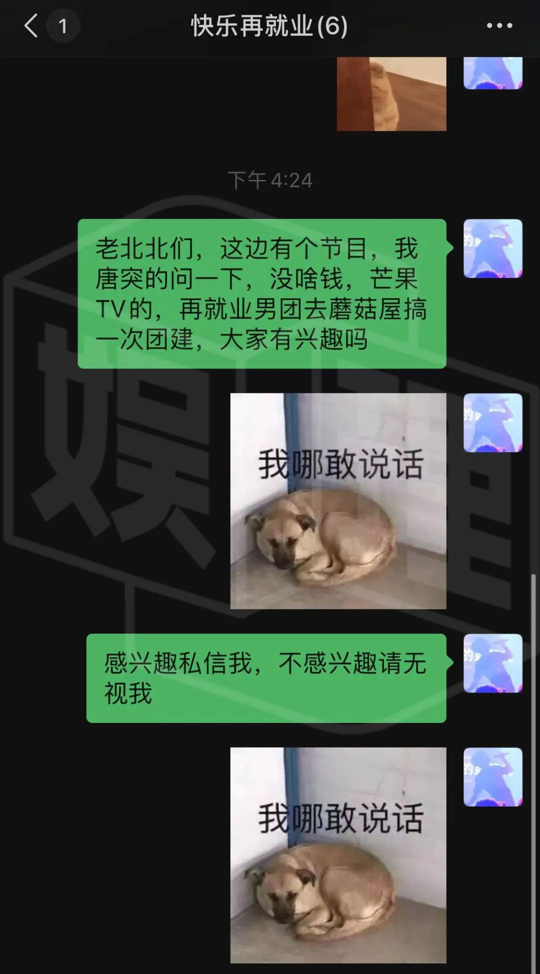 >“老北北们,这边有个节目,我唐突地问一下,没啥钱,芒果TV的,再就业男团去蘑菇屋搞一次团建,大家有兴趣吗?”