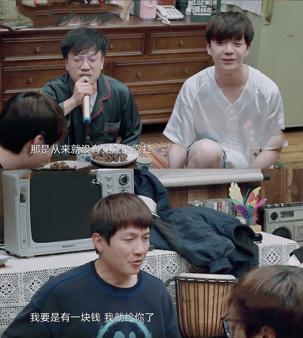 >认识十几年的六个兄弟,一上来就在镜头前互怼、揭老底,聊的都是其它综艺里不敢提的“你当初对谁的名次最不服”。夜深人静时他们聊起过往,拿起吉他即兴唱着自己的“活该”。这种有趣、真诚、不扭捏的状态让节目破了圈,弹幕里满屏飘着:他们也没活儿,就让他们住下吧。