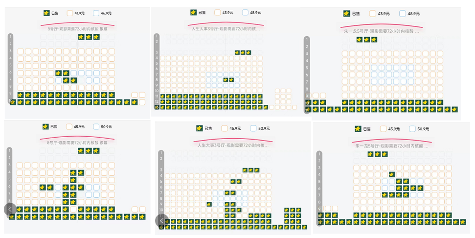 在淘票票上,小艾也随机查看了杭州一家影城的出票情况。今日该影城共排了5场,截至下午4点,18:10场出票11张含两张情侣座,19:20场14张含两张情侣座,20:15场5张,21:25的场次2张;22:20场5张,也就是截至下午4点,首映日出票37张;而周六排了12场,出票7张。