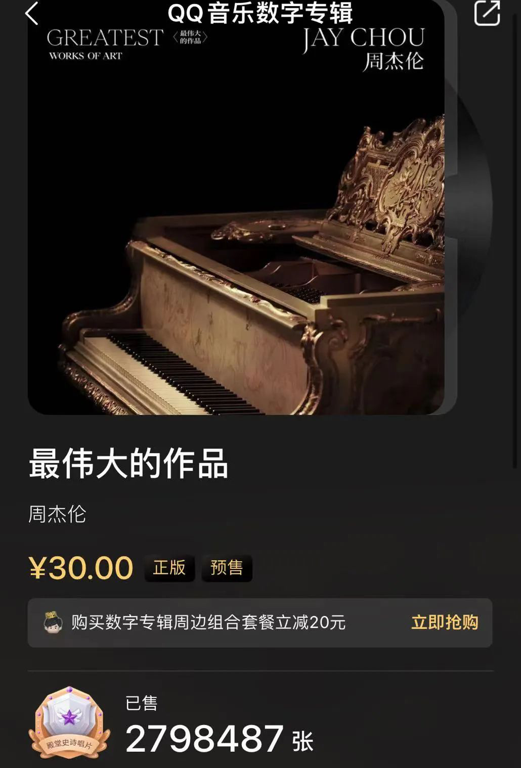 在微博,#周杰伦先行单曲#的话题斩获9亿阅读;在QQ音乐,《最伟大的作品》MV上线仅两小时,播放、分享、评论均已刷新单日数据记录;在B站,该MV观看量现已突破2800多万,投币高达230多万;再说快手,该MV上线3小时点赞便已破250万,8小时播放量突破1.5亿……