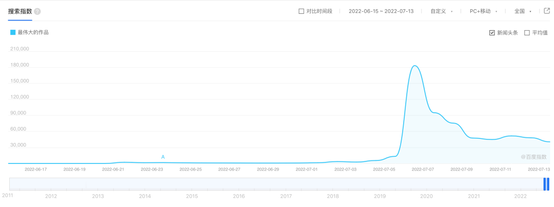 综合各种指数来看,《最伟大的作品》在发出的第三天前后搜索和浏览的峰值。这正与粉丝发布二创最活跃的时间段重合。
