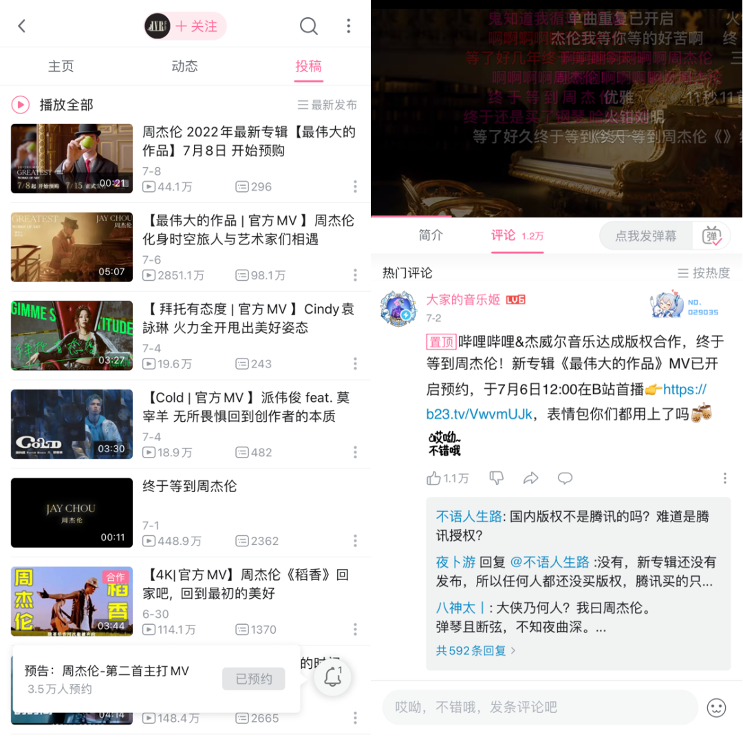 B站瞄准机会率先出招。 6月29日,杰威尔音乐的官方账号就已在B站预热,发出“给我一首歌的时间,这次不鸽了!”的暧昧信号。7月1日,杰威尔音乐的官方账号在B站发布《终于等到周杰伦》视频,新歌预告顿时将粉丝的期待值拉满,“哥终于营业了”“不够看”“哎呦不错哦”的呼声从评论区传来。
