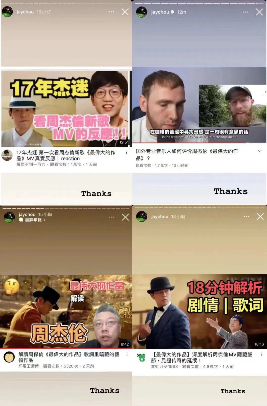 其中,B站UP主们的二创视频存在感最强,频繁出现在朋友圈、短视频和各路热点里。硬糖君就是在#最伟大的作品解读#微博热搜里,看完UP主@不是柯桑德的视频,成功直达B站卷疯了的二创战场,补完各种版本的《最伟大的作品》。(一个热知识,周董也点赞了这个二创作品!)