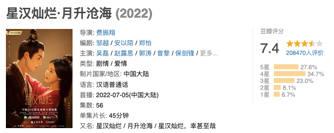 6月上线的《梦华录》已经被行业翻来覆去分析了个遍,读娱君不再赘述。而《星汉灿烂》还能继续以古装类型实现领跑7月,豆瓣评分也达到了同类型水准以上的7.4分,这其实是有些超出行业预期的。从《星汉灿烂》的差异化创作理念中,我们或许也能一窥近期古装剧进阶的“寻路方向”。