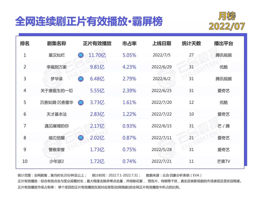 在今夏的剧集热潮里,古装剧占了很大一部分比重。云合数据显示,7月全网连续剧有效播放前五名里就有《星汉灿烂》《梦华录》《沉香如屑》三部古装剧,其中《星汉灿烂》在7月的有效播放霸屏榜和集均V7有效播放榜中位列第一。