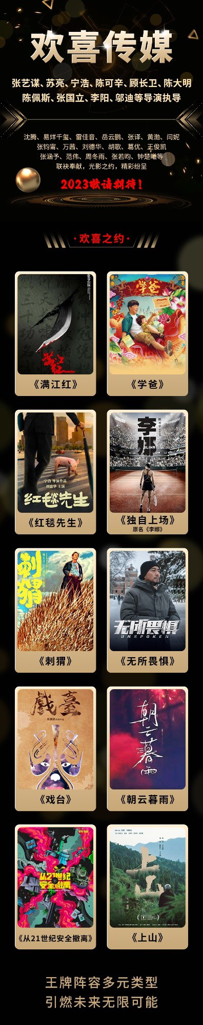 此外,欢喜传媒发布的2023年电影片单还包括宁浩执导,刘德华主演的《红毯先生》;陈可辛执导,胡歌、Vincent Cassel及郝蕾等主演的《独自·上场》;顾长卫执导,葛优及王俊凯主演的《刺猬》;陈大明执导,张涵予主演的《无所畏惧》;陈佩斯执导并主演的《戏台》;张国立执导及编剧,周冬雨主演的《朝云暮雨》;李阳执导,张若昀及钟楚曦主演的《从21世纪安全撤离》;王小帅监制,邬迪执导的《上山》等重量级影片。