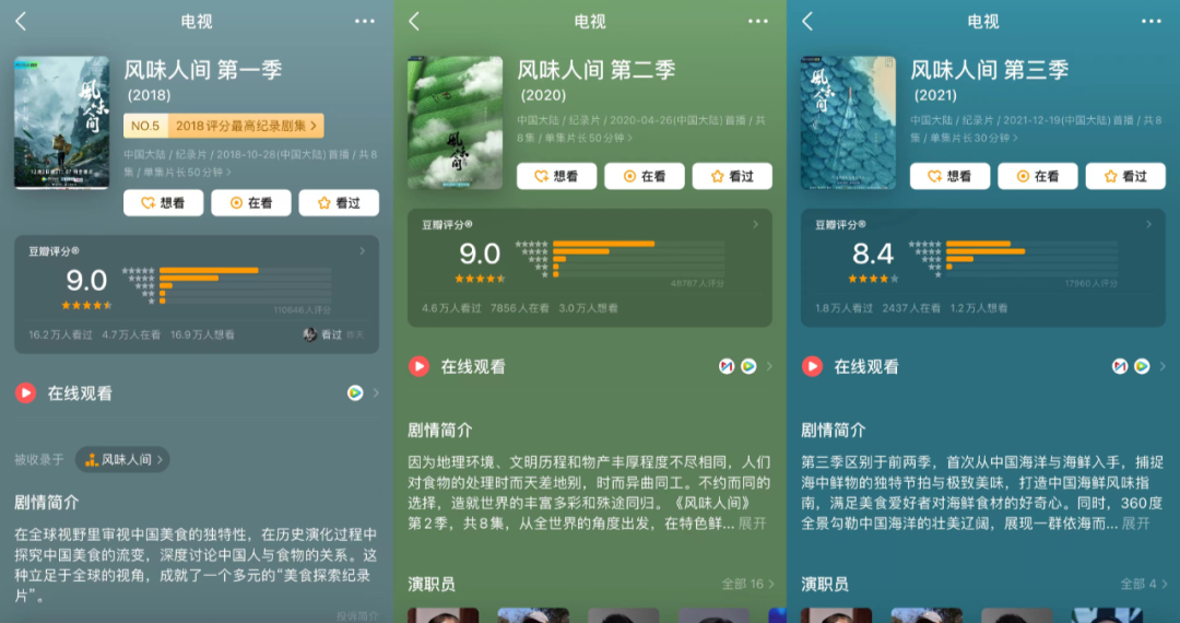 《风味人间》的四季作品,豆瓣评分都维持在9.0左右的高位,但已完结的前三季的评分人数,分别为11万、4.8万和1.79万。