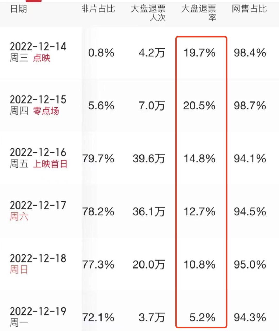 首先可以确定的是,国内第一批想去看《阿凡达2》的观众,被各种原因困住了脚步。这从《阿凡达2》非比寻常的退票率便能感知到。一般来说,电影的退票率为5%。超过8%都有“退票门”的嫌疑了。