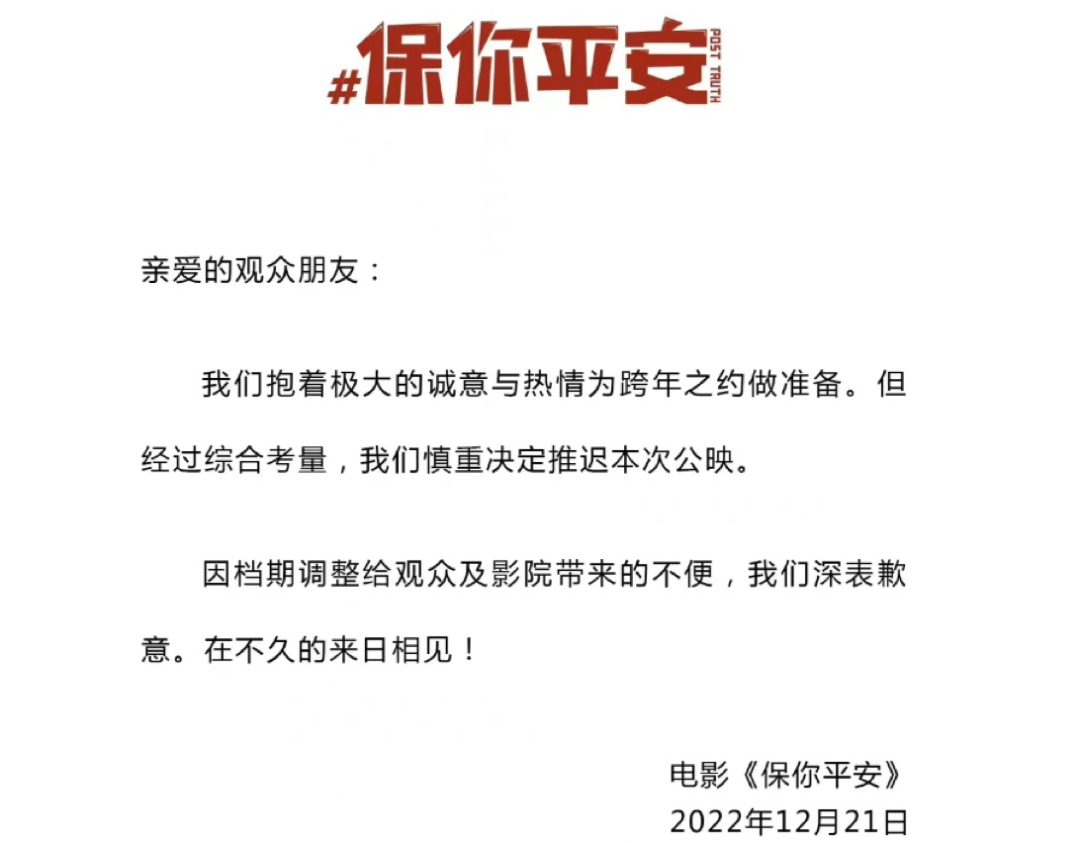 这不,就在12月21日,原本宣传最卖力、准备圣诞节大规模点映的跨年档电影《保你平安》突然宣布撤档。对此,硬糖君听到最精辟的行业笑话是:《阿凡达2》票房太好,会吓跑;《阿凡达2》票房太差,也会吓跑。