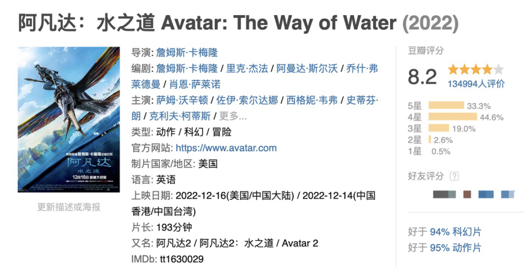 一部电影的票房不及预期,除了找客观原因,就是找主观原因。于是,豆瓣8.2分、猫眼9.2分的《阿凡达2》就被定义为“口碑扑街”。国内可以说是分数虚高,但实际上,《阿凡达2》国外的口碑指标也不逊色:IMDB一直保持在8分以上,烂番茄80%以上,爆米花指数高达94%。