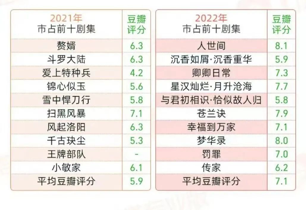 从口碑评分上来看, 对比2021年的热播剧集前十名来看,今年影视剧整体评分都有所提高。去年前十名热播剧TOP10中最高评分的《扫黑风暴》只有7.1,而今年热播剧TOP10中评分最高的《人世间》8.1分。从整体平均评分来看,去年热播剧平均分是5.9,今年则上升到了7.1,同比上涨 1.2。并且,今年古装剧总体也有着很明显的提高,暑期档《苍兰诀》《星汉灿烂.月升沧海》两部剧也超过了7.5,《梦华录》则收获了8.0的高分,去年暑假热播古装剧《斗罗大陆》《千古玦尘》两部古装剧平均分都没超过6.5,“降本增效”成效十分显著。
