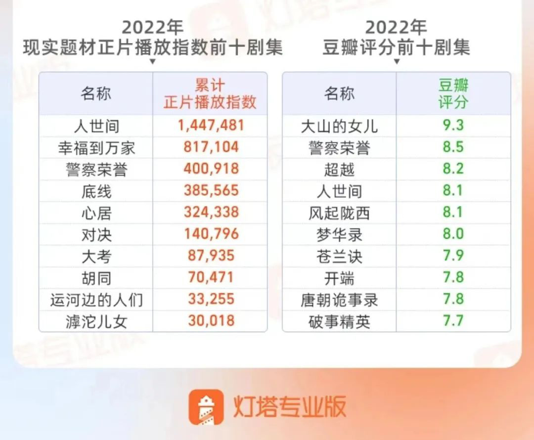 回看2022年,在行业提质减量与平台降本增效的双重作用下,剧集质量有了明显提升。与此同时,随着网播“龙标”许可证的正式发放,线上线下内容审核的标准得到进一步统一,并促进着国产剧质量的提升。