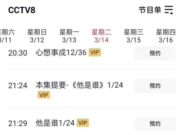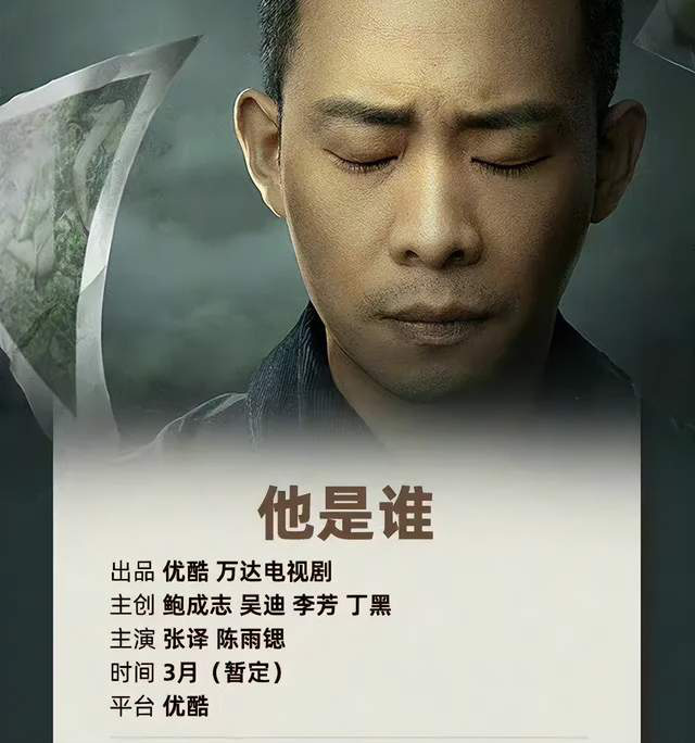 24集电视剧《他是谁》将于3月14日起登陆CCTV8,在每晚9点半,也就是次黄金档期播出,每日更新一集。该剧由丁黑监制,鲍成志导演执导,张译、陈雨锶领衔主演,丁勇岱、俞灏明特别出演,赵阳、刘冠麟友情出演。
