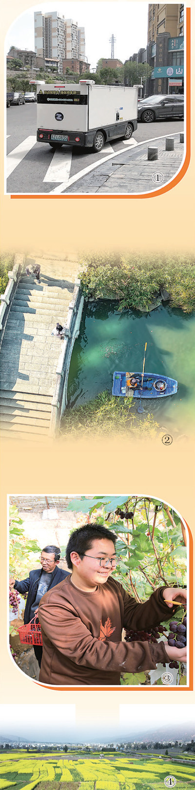图①:一辆无人驾驶快递车行驶在湖北宜昌市夷陵区小溪塔街道道路上。张国荣摄(人民视觉)